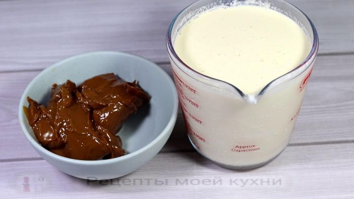 Во взбитые сливки добавить сгущенное молоко и продолжать взбивать до соединения компонентов и устойчивой сливочной массы.