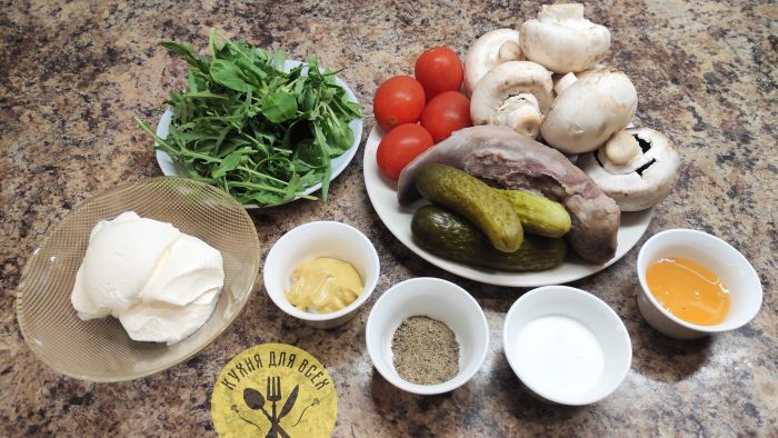 Нарезаем язык на небольшие кубики.Грибы шампиньоны нарезаем на небольшие кусочки и обжариваем в течении 3-4 минут на растительном масле. Маринованные огурцы нарезаем на кубики размером, как был нарезан язык. Помидоры черри нарезаем на четвертинки.
