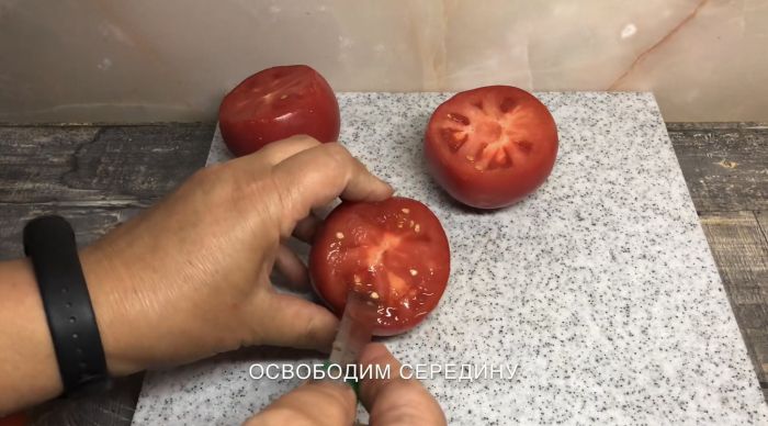 Отрежем концы 3 помидоров и освободим середину