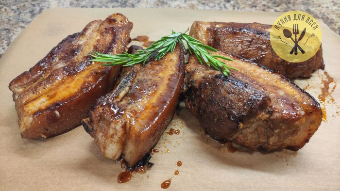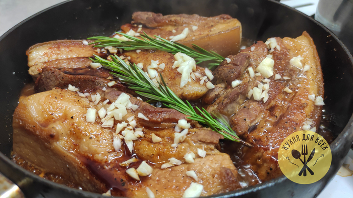 За 10 минут до готовности поливаем грудинку соусом, посыпаем крупно нарубленным чесноком и добавляем пару веточек свежего розмарина.