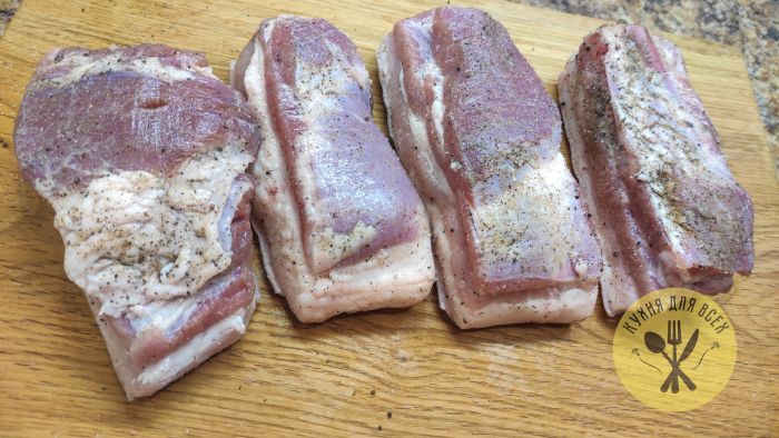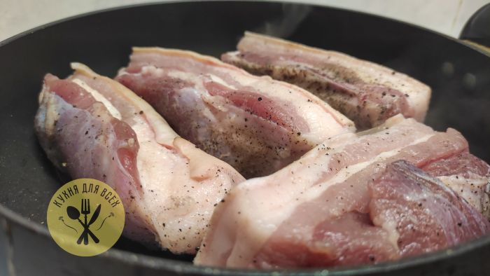 Очень хорошо разогреваем сухую сковороду, на которую выкладываем грудинку и начинаем обжаривать до хорошей золотистой корочки. Жарим без крышки и не забываем открыть окно. Будьте осторожны, растопленный жир может брызгать и стрелять в разные стороны.