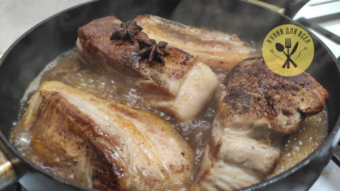 После того как мы хорошо обжарили грудинку, выливаем к ней темное пиво и добавляем пару звездочек бадьяна. Закрываем крышкой и на среднем огне тушим примерно 30 минут, периодически переворачивая. После того как пару раз перевернули, посыпаем грудинку сухим чесноком.