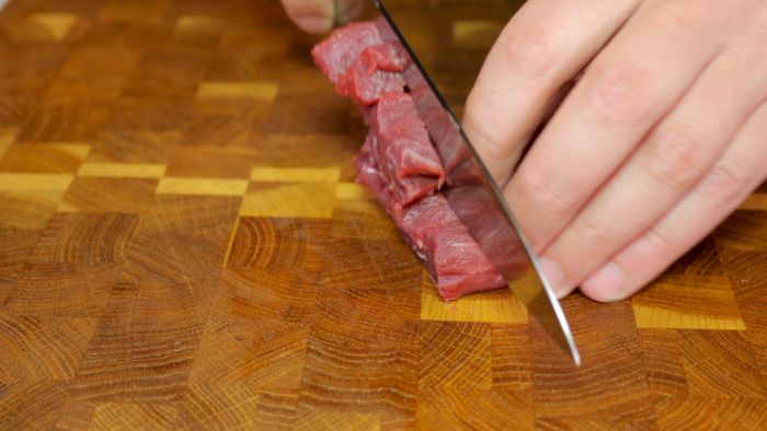 Произвольными полосками нарезаем бекон. Некрупным кубиком нарезаем говяжью вырезку.