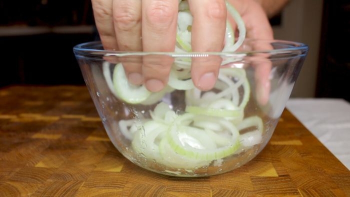 Лук очищаем от шелухи. Одну головку нарезаем кубиками. Вторую - кольцами. Перекладываем кольца лука в глубокую миску, разделяя их. Добавляем чайную ложку соли. Чайную ложку сахара. И чайную ложку рисового уксуса. Можно взять обычный яблочный, но с рисовым получается вкуснее. Перемешиваем содержимое миски.