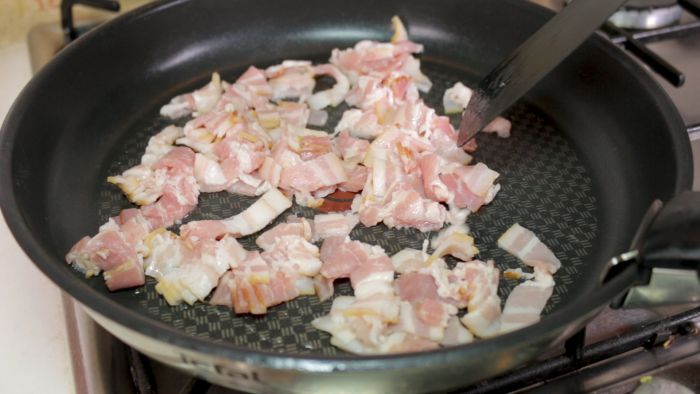 На холодную, сухую сковороду выкладываем бекон. Включаем огонь чуть ниже среднего. Распределяем бекон равномерно по сковороде, вытапливаем из него жир и обжариваем помешивая. Когда бекон обжарится, а жир из него вытопится извлекаем его из сковороды.
