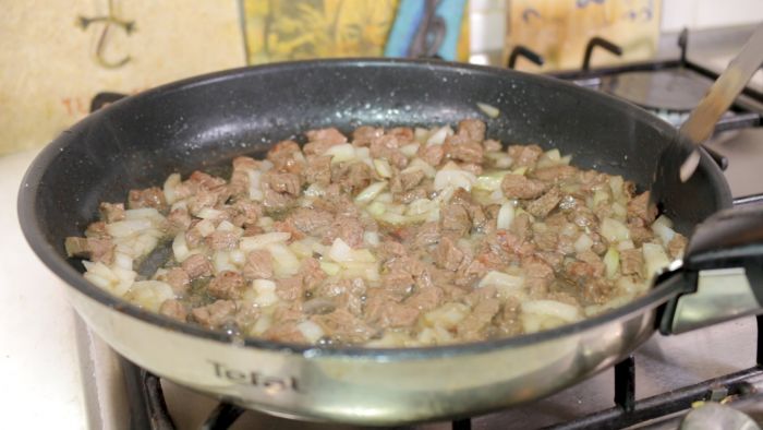 В оставшемся от бекона жире обжариваем говяжью вырезку. Обжаривается она достаточно быстро. Как только кусочки мяса схватятся со всех сторон, добавляем лук, свежемолотый перец и соль. Обжариваем всё вместе до готовности мяса. На это потребуется не более 5 минут.