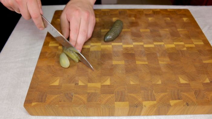 Через 40 минут снимаем с бутерброда гнёт. Разрезаем его на порционные кусочки и с удовольствием съедаем! Приятного аппетита!