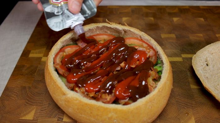 У булки хлеба срезаем верхнюю часть. Извлекаем из неё мякоть. На дно булки выкладываем листья салата. Далее слоями выкладываем обжаренную говяжью вырезку, маринованный лук, соленые огурцы, томаты, присыпаем овощи обжаренным беконом. Добавляем кетчуп и соус bbq. Поверх соусов помещаем говяжью нарезку, сыр для бургеров, свиную нарезка и листья салата. Закрываем бутерброд срезанной крышкой от булки. Заворачиваем в фольгу и кладём под гнёт на 40 минут.