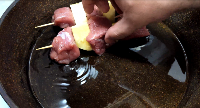 Берем шпажку и насаживаем на неё мясо, чередую его с кусками ананаса.
