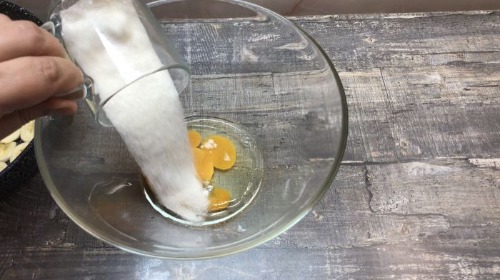 Высыпаем на сухую сковороду сахар и добавляем нарезанные бананы
