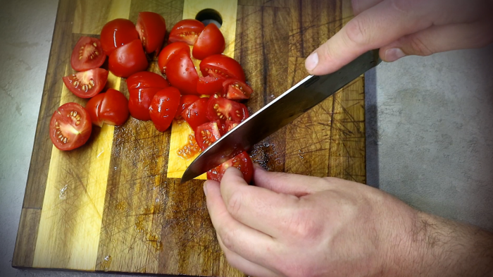 -измельчим красный сладкий перец, лук, чеснок и помидоры, по сути, все произвольно, всё равно все.
