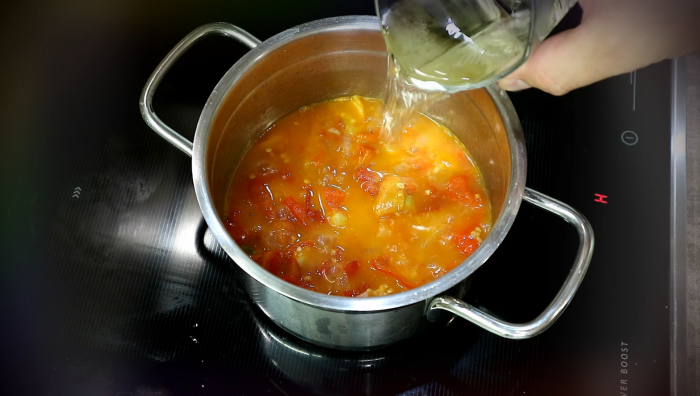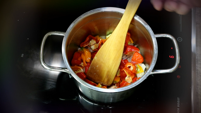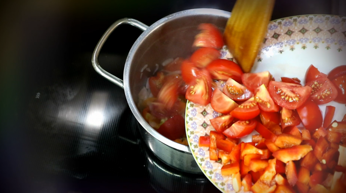 Далее в кастрюлю добавляем нарезанные помидоры, сладкий перец и чеснок. Через 2 минуты добавляем воду и накрываем крышкой для тушения - 10-15 минут на среднем огне.