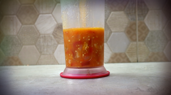 Все потушенные овощи вываливаем в блендерную чащу и перемалываем в однородный соус.