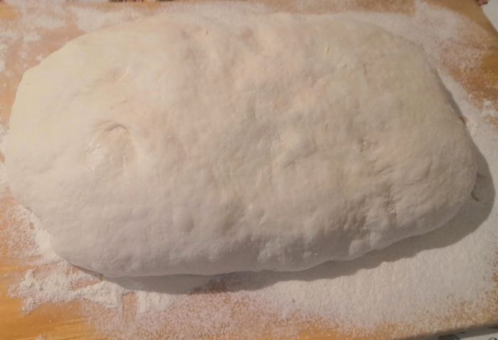 2. Выбраживание идёт при комнатной температуре. Лучше всего если она 21-23С. Обминки производят через 30 и 60 минут после начала брожения методом stretch & Fold (растяни и сложи). Обминать надо до явного уплотнения теста. Перед второй обминкой обмазать тесто ещё 10 ил оливкового масла. Общее время выбраживания 120 минут.