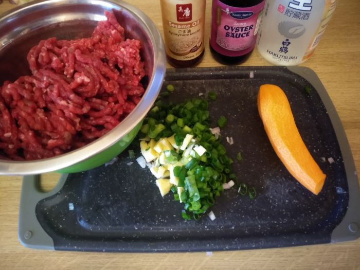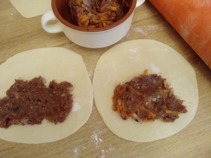 Традиционные китайские пирожки с говяжьим фаршем, зеленым луком и морковью.