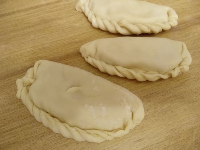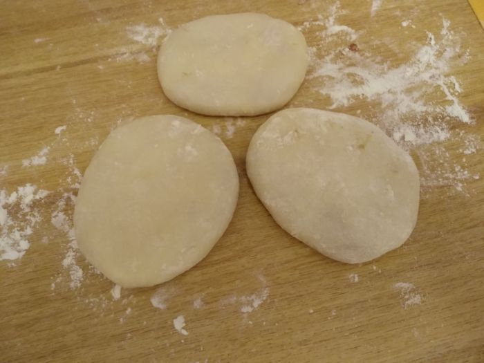 Тесто обомните, разделите на 10 частей. В середину выложите начинку, края защипните и пирог приплюсните.
