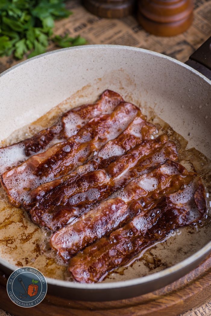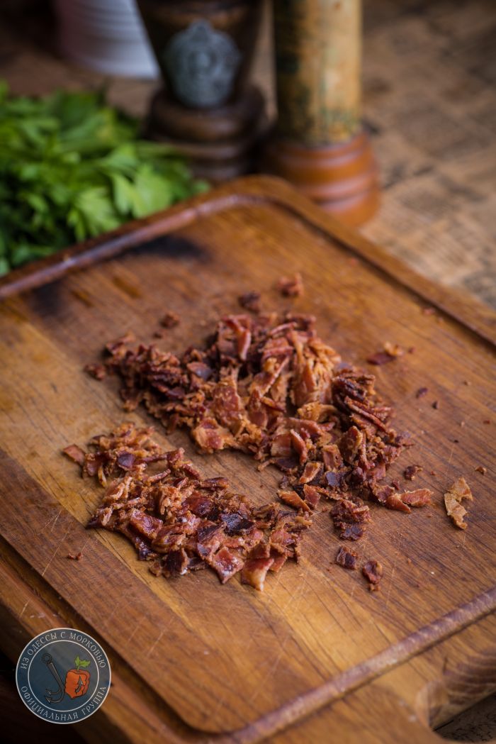 - Бекон поджарить. Я уже говорил об этом, но повторюсь. Мне нравится способ, в котором бекон выкладывается в холодную антипригарную сковороду, слегка сбрызгивается холодной водой и на небольшом огне спокойно жарится. Можно один раз перевернуть. Так его меньше «крутит». В конце бекон убрать, а 2-3 ст.л. жира аккуратно слить в пиалу. Жир этот ароматный и еще понадобится. Дать бекону остыть на бумажных полотенцах, чтобы убрать лишний жир, потом сложить стопкой один на другой и нарезать мелким кубиком.