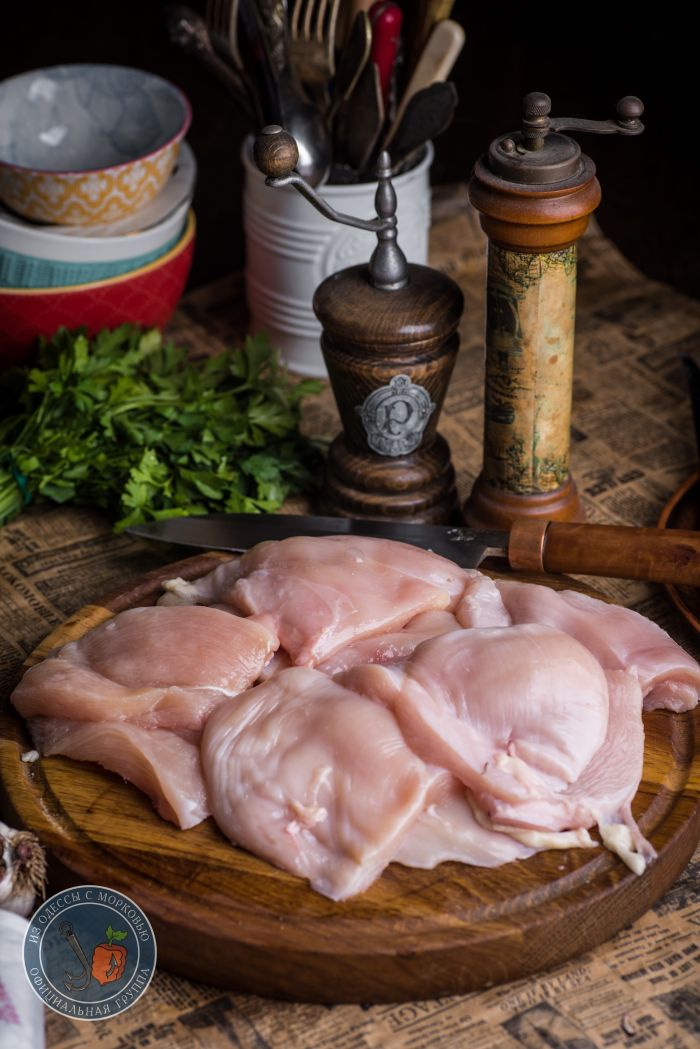 -Мясо: вместо филе отлично идут бедра, на кости или без. В случае с филе, если вам достались филе мелкого размера, их можно и не резать вовсе, а готовить целиком.