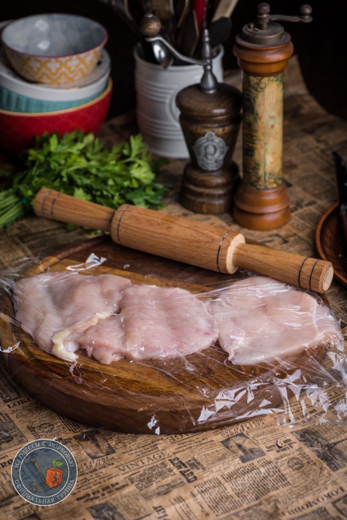 - Выложить на доску 3-4 куска, накрыть пленкой или пергаментом и слегка отбить. Повторить с оставшимися.