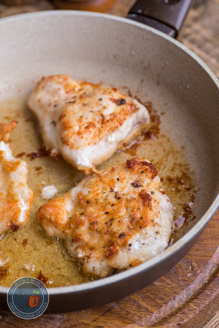 - Высыпать 70г муки в глубокую тарелку и обвалять курицу по 3-4 куска. Готовить 5-6 минут на среднем огне до красивого, румяного цвета. Таким вот незамысловатым образом разобраться с оставшейся курицей. Напоминаю, что сковороду не перегружать и с огнем не увлекаться. Масло в конце готовки должно остаться в меру чистым и черных пригорелостей тоже быть не должно. Только коричневые и то, не темные. Если вдруг они появились, сковороду вымыть и в следующем этапе готовить в чистой.