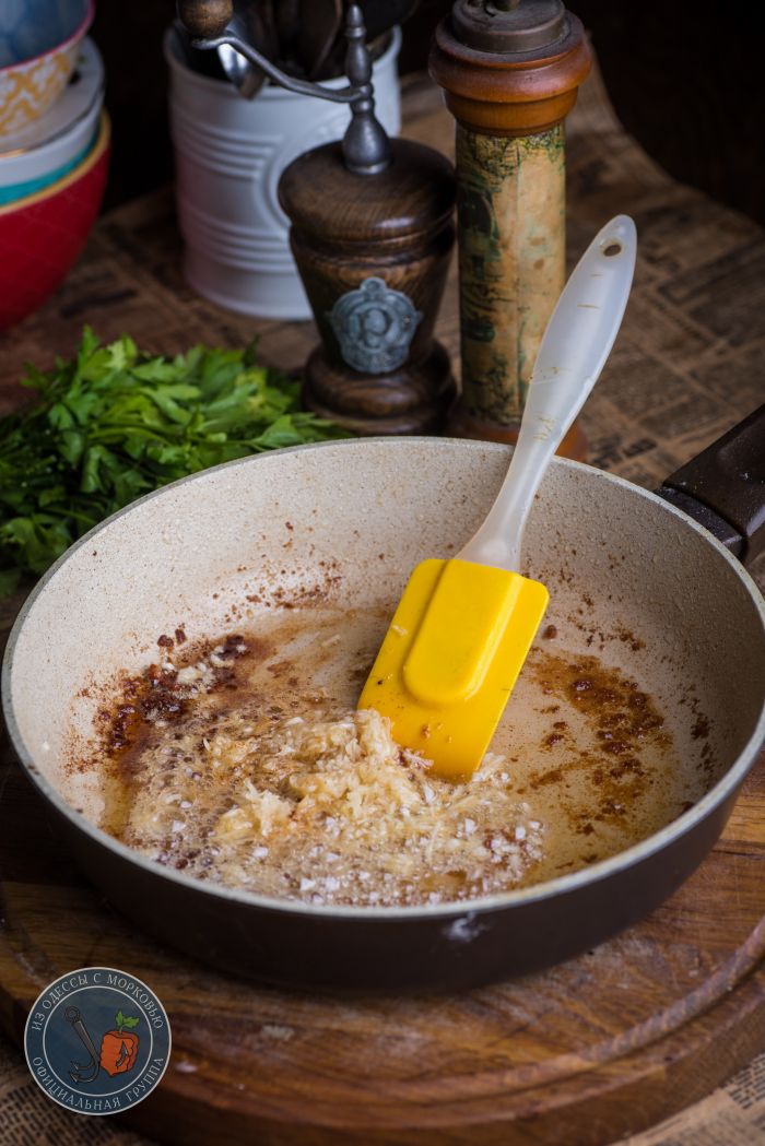 - В оставшееся масло влить жир от бекона и натертый на мелкую терку чеснок. (если не желаете использовать жир от бекона, его можно проигнорировать или добавить 1-2 ст.л. сливочного масла) Готовить на небольшом огне 1 минуту, помешивая силиконовой или деревянной лопаткой и «оттирая» со дна все, что до этого прилипло.