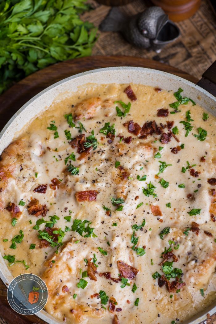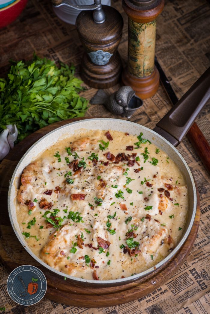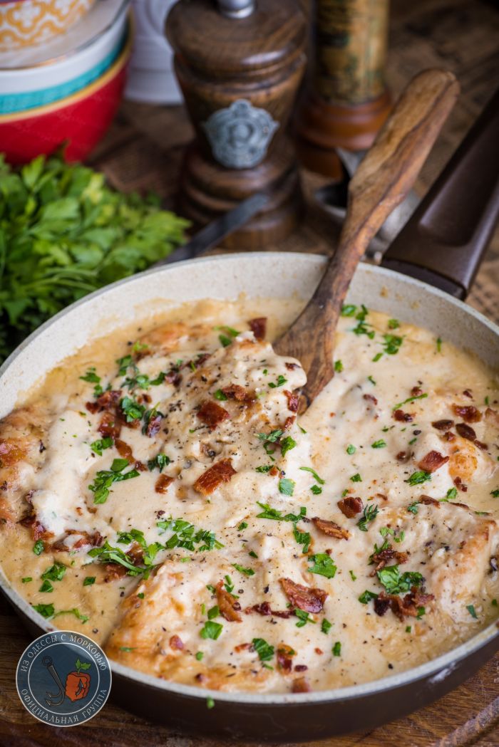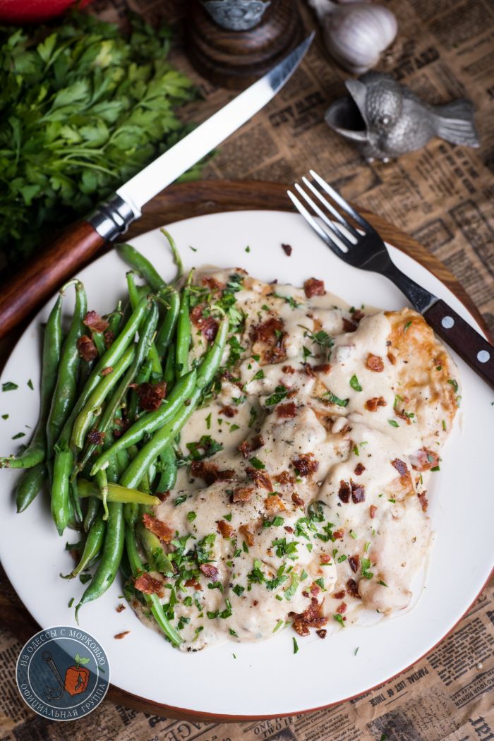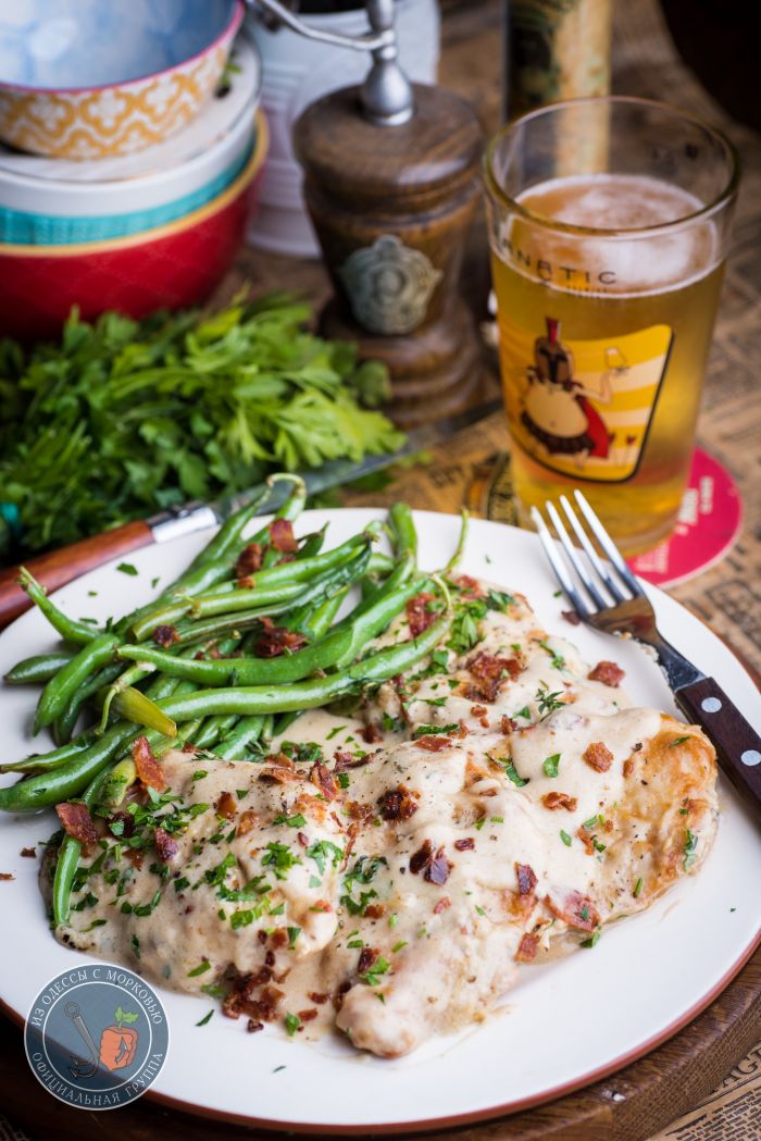 Всю эту красоту оттеняет свежая петрушка и бекон. К такой курице можно ничего сложного не выдумывать, а просто смастерить картофельного пюре или сварить пустой рис. Соус сделает тут всю работу. Мне в этот раз картошки не хотелось и я по-быстрому сколхозил себе фасоли поджаренной.