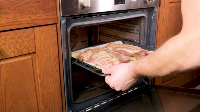 Помещаем противень с рёбрами и картошкой в разогретую до 220 градусов духовку на 20 минут.