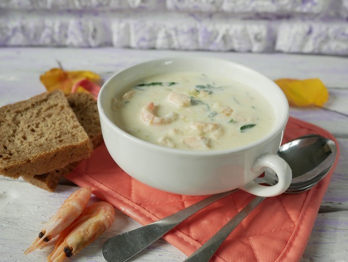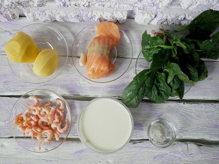 Вечер не самое правильное время для первых блюд, но мне бы хотелось поделиться с вами таким замечательным и простым рецептом супа с сёмгой, шпинатом и креветками, и уже завтра к обеду сможете порадовать себя и своих близких сливочным и ароматным супчиком.