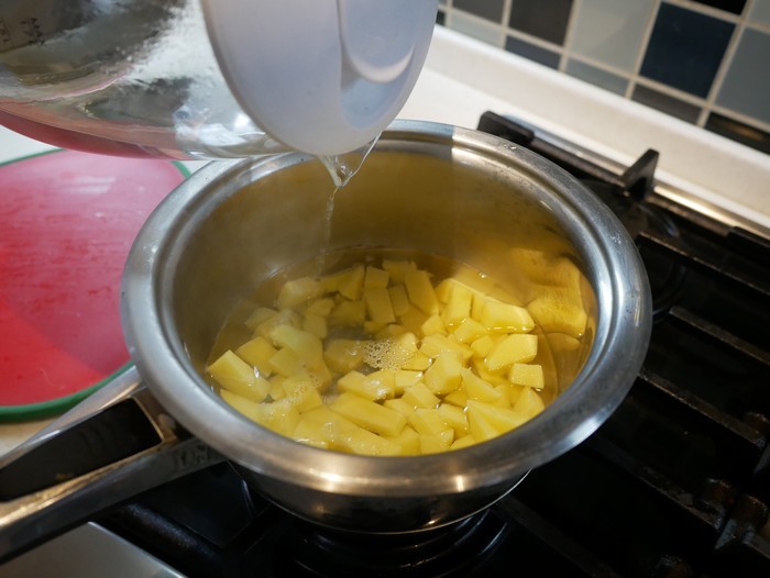 Картошку режем небольшими кубиками, отправляем в кастрюлю и заливаем кипятком, чуть выше картошки. Варим на среднем огне практически до готовности.