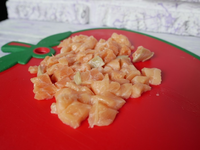 Сёмгу (или любую другую рыбу нарезаем на кусочки. Добавляем её к картошке, когда та сварится. Варим еще минут 10.
