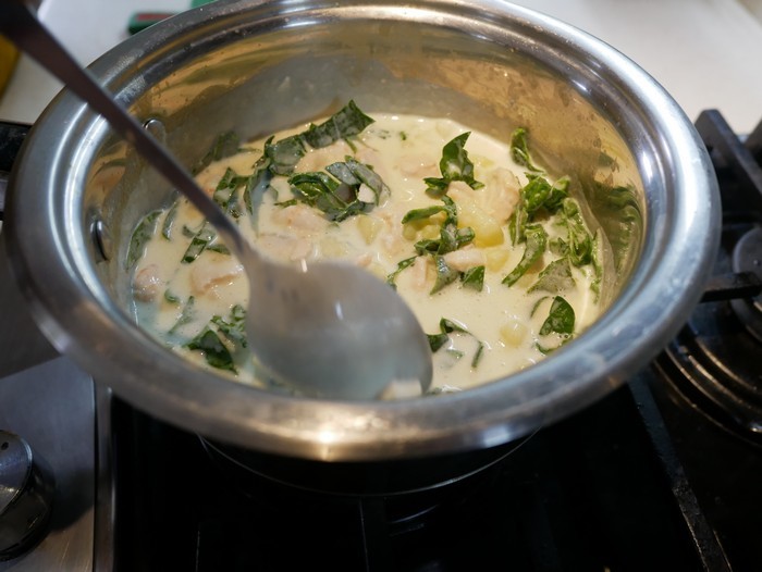 Нарезаем чеснок и шпинат и сразу добавляем в суп.