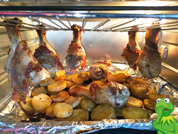 Подвешиваем ноги на решетку, здесь я упустил, кончики лапок надо бы в фольгу завернуть, дабы не сгорели :) Смотрите, чтобы курица висела над картошкой. Ставим на 1,5 часа на 180°.