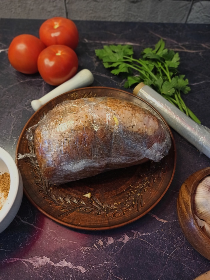 Заматываем в пищевую пленку и в холодильник часов на 12-24 :) Можно и меньше, но вкус будет немного другой. Я убрал на ночь.