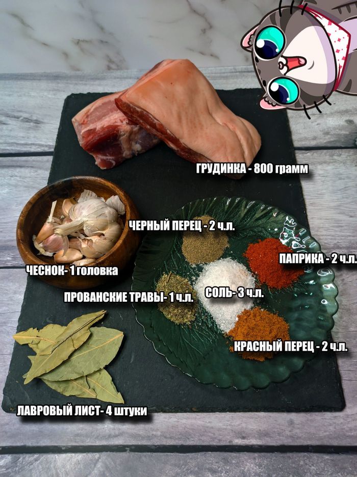 Натираем грудинку солью, потом смесью приправ. Чеснок чистим и пропускаем через чеснокодавилку и также плотненько обмазываем мясо. Люблю чеснок :)