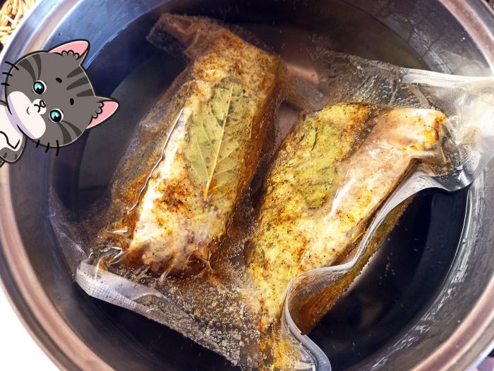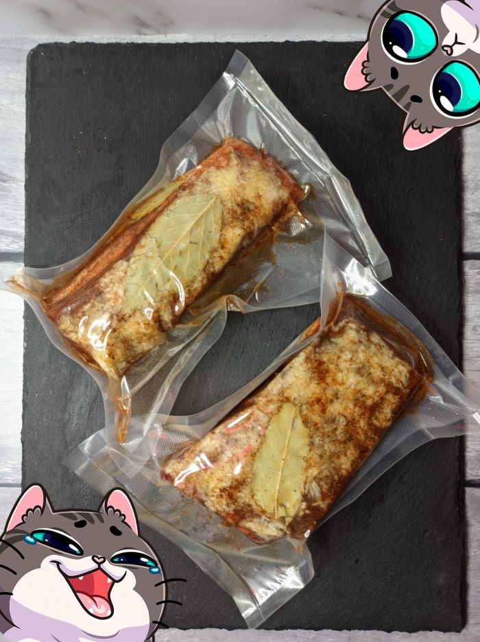 Кладем лавровый лист в пакет, засовываем грудинку и удаляем воздух.