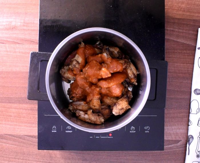Прогреваем пару минут жаренные крылья в томатной основе, постоянно помешивая и всё готово.