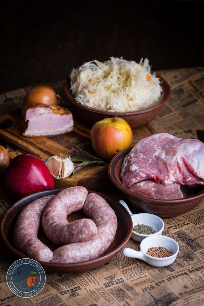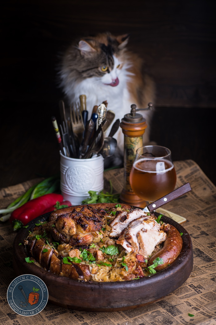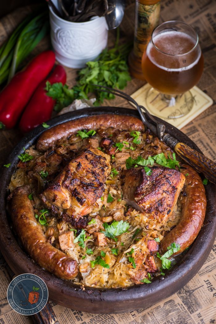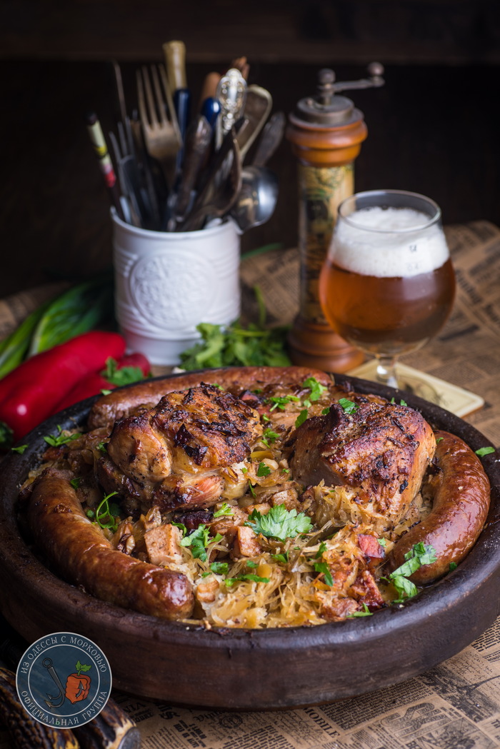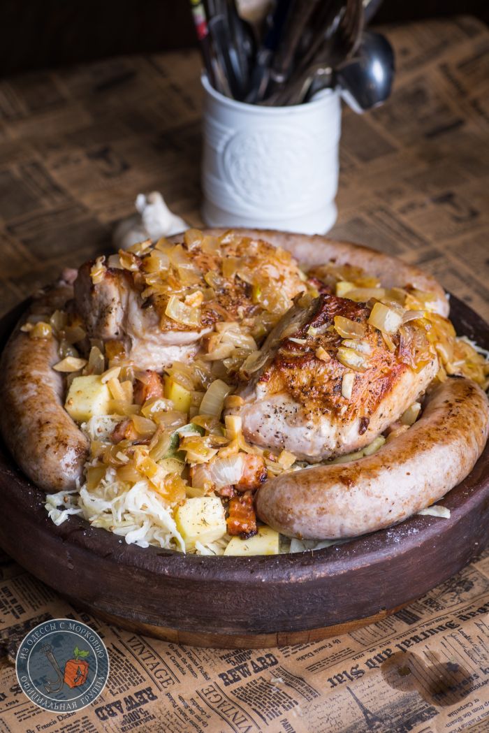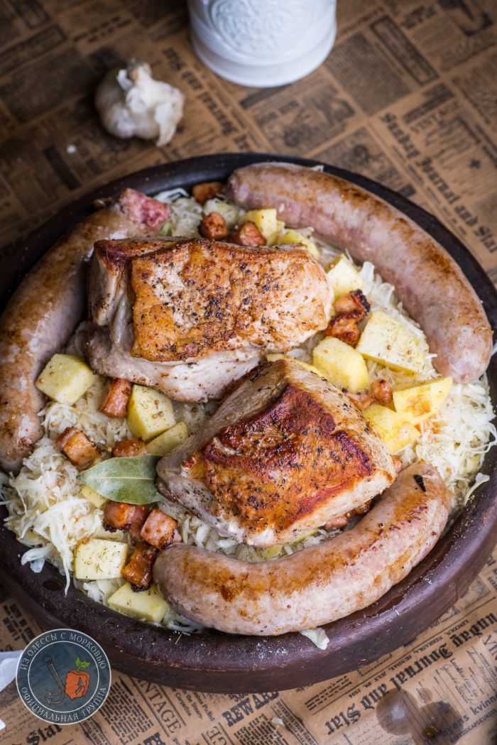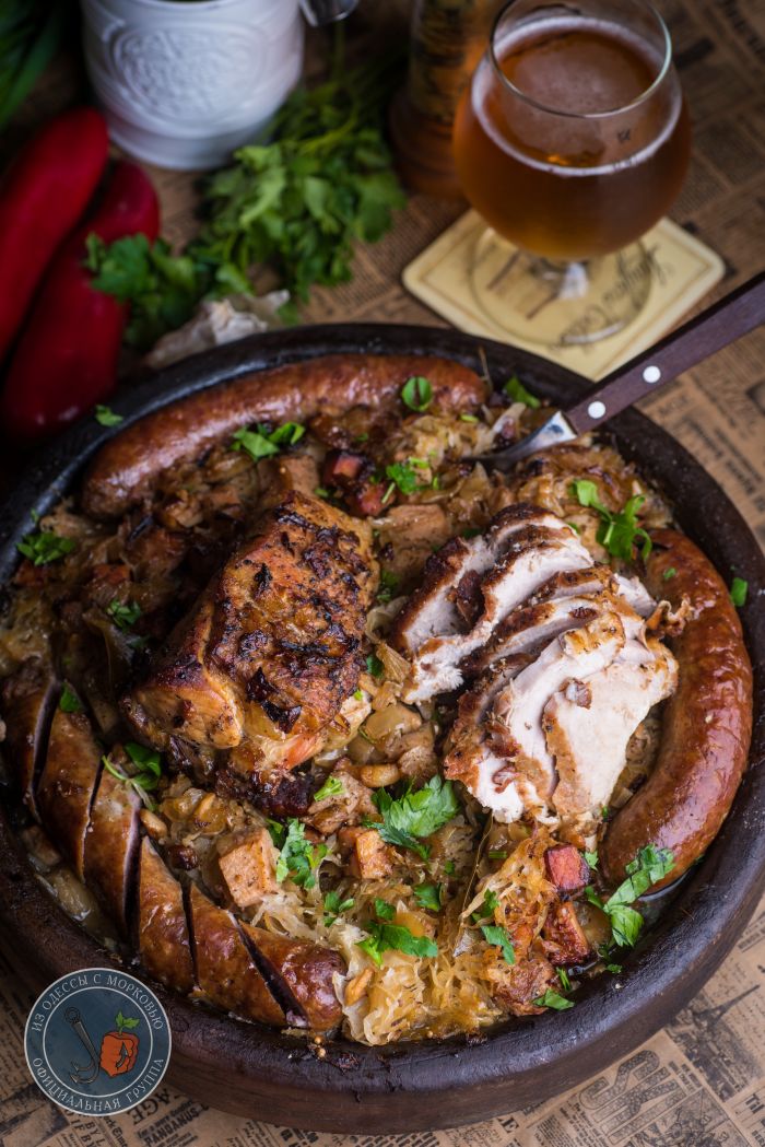 Здравствуй, честной народ. У нас «классическая» зима- почти всю неделю пасмурно, дождь, слякоть и прочие прекрасные штуки. И вот на днях поймал себя на мысли, что мне решительно захотелось грубой и простой еды. Вот так, чтоб большое блюдо с капустой, уверенные куски мяса и колбаски. И чтобы пиво в холодильнике ждало. А раз желание сильно, то и преград никаких нет.