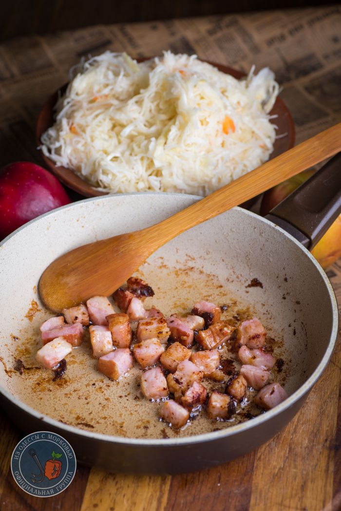 - Бекон или грудинку нарезать кубиком, забросить в холодную сковороду и на среднем огне поджарить до уверенного состояния. Не забываем перемешивать. Готовую грудинку вынуть с помощью шумовки, почти весь жир слить (но не выбрасывать. На нем утром можно пожарить отличную антизожную яичницу), оставив в сковороде 2-3 ст.л.