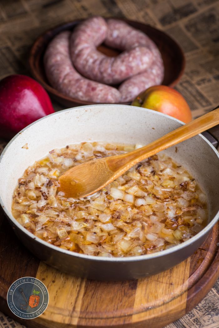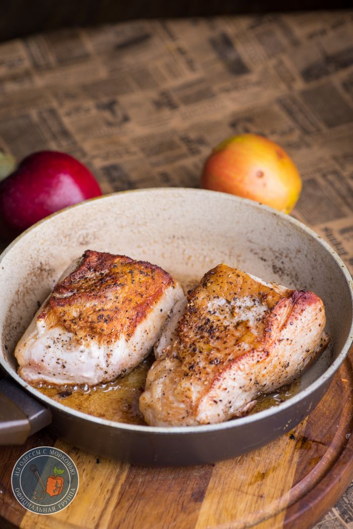 - По желанию, на манер, как я делаю с рулькой, можно поджарить на сливочном масле с добавлением сахара дольками яблоки или айву.