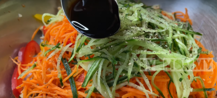 12) Собираем салат: добавляем оставленный ранее свежий болгарский перец, сахар, уксус, нашинкованную морковь, огурец, всё посыпаем черным перцем по вкусу, кладём 2 ст. л. соевого соуса и кунжут по желанию.