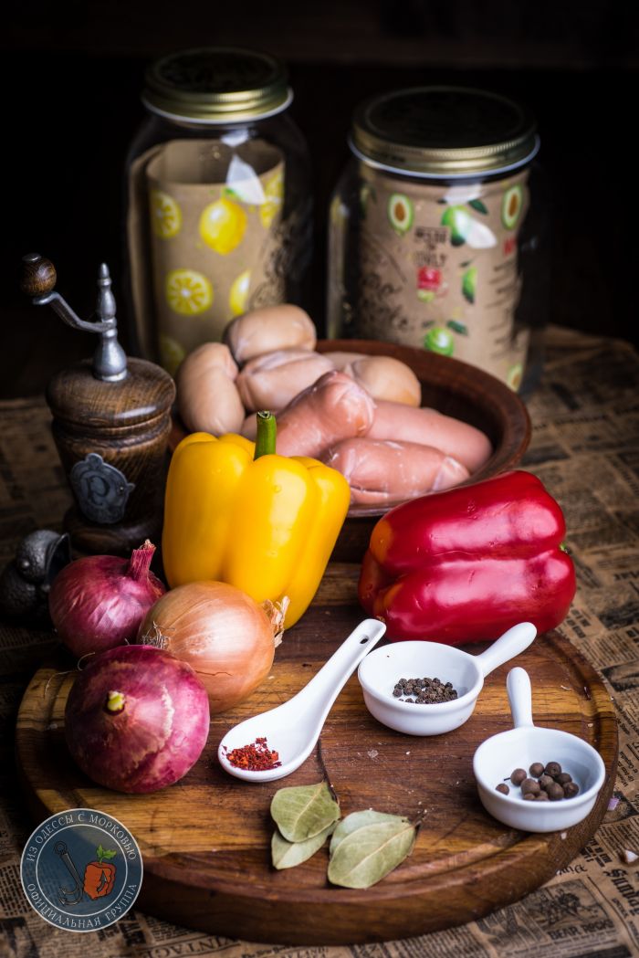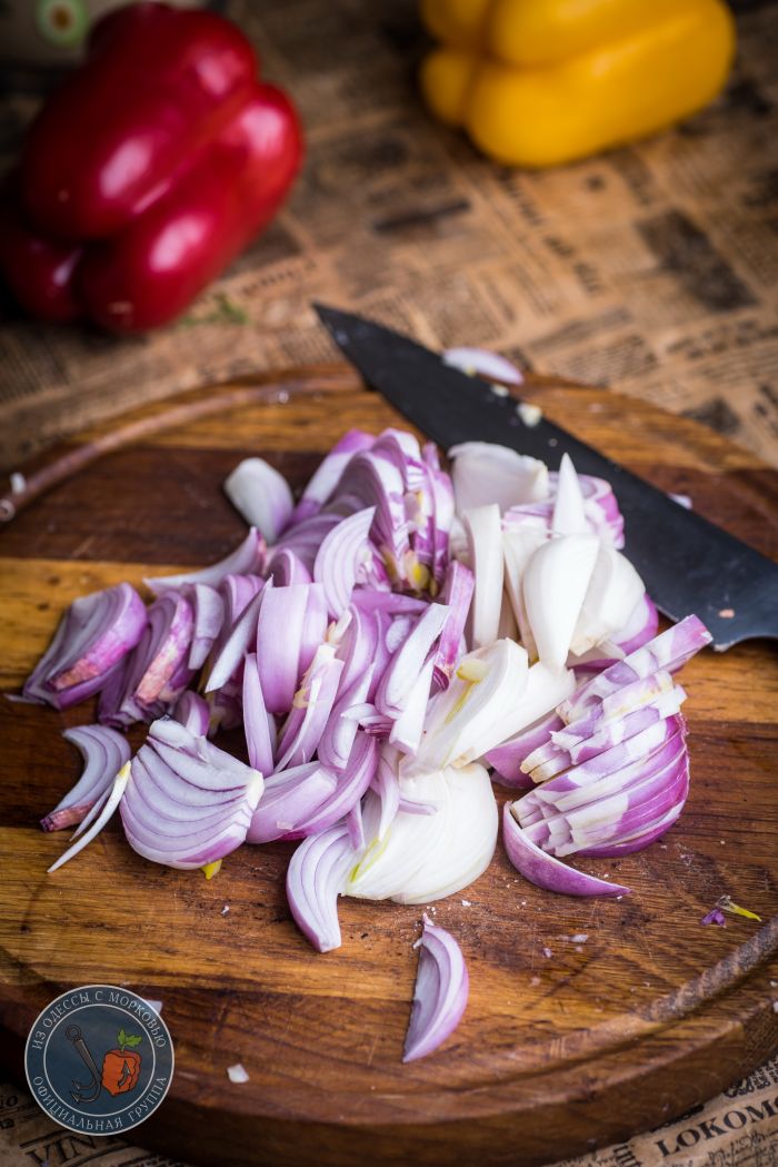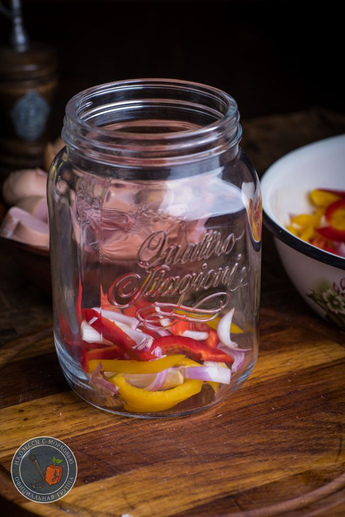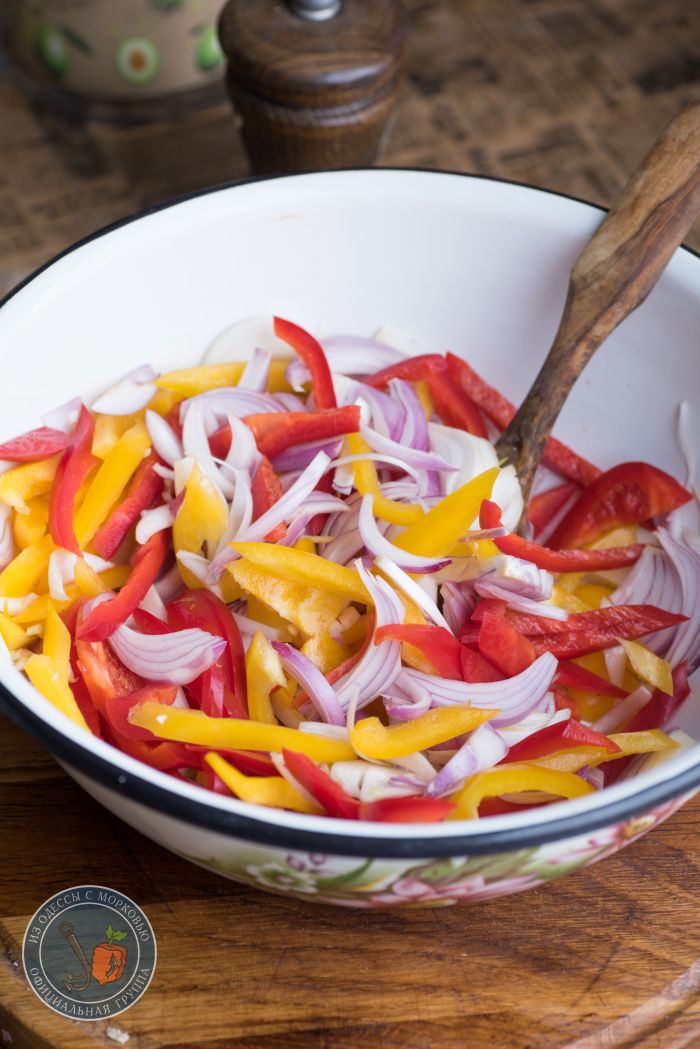 - Овощи: можно сделать исключительно базовый вариант, добавив только лук. Много лука. Лично мне нравится вкус маринованных овощей и особенно- сладкого перца. С ним получается вкуснее, разнообразнее и интереснее. Ну и это красиво, как ни крути.