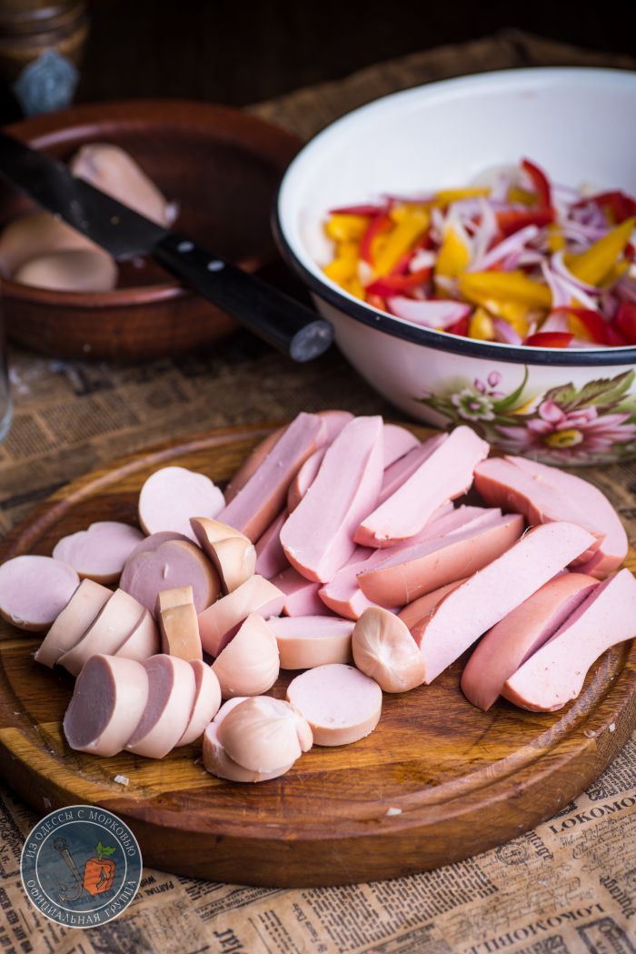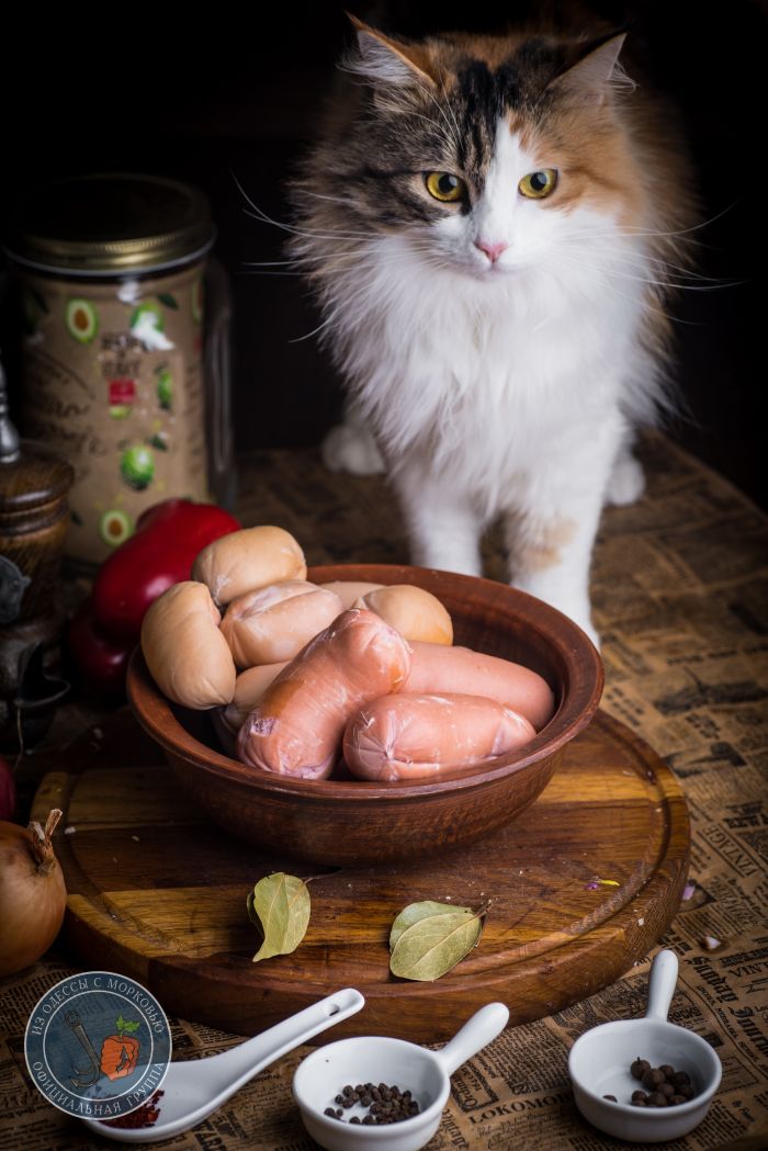 - Колбаски: обычно для этого блюда используют именно шпикачки- свиноговяжие колбаски с кусочками жира. Лично я не большой их фанат и тут склоняюсь в сторону обычных сарделек-сосисок. Но да, со шпикачками вкус будет более интенсивный. Если любите, берите их.