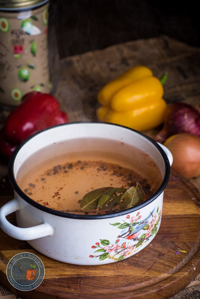 - В кастрюле литра на 3 смешать все ингредиенты для маринада. Довести до кипения и проварить 3-5 минут. Важный момент- основной вкус тут строит сам маринад. Так что в этот момент его надо попробовать и откорректировать по своему вкусу. Маринад должен быть кисло сладким. Без перевеса в сторону кислого. Снять и огня и полностью охладить.