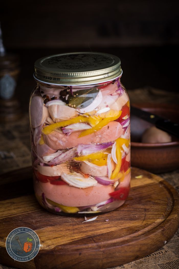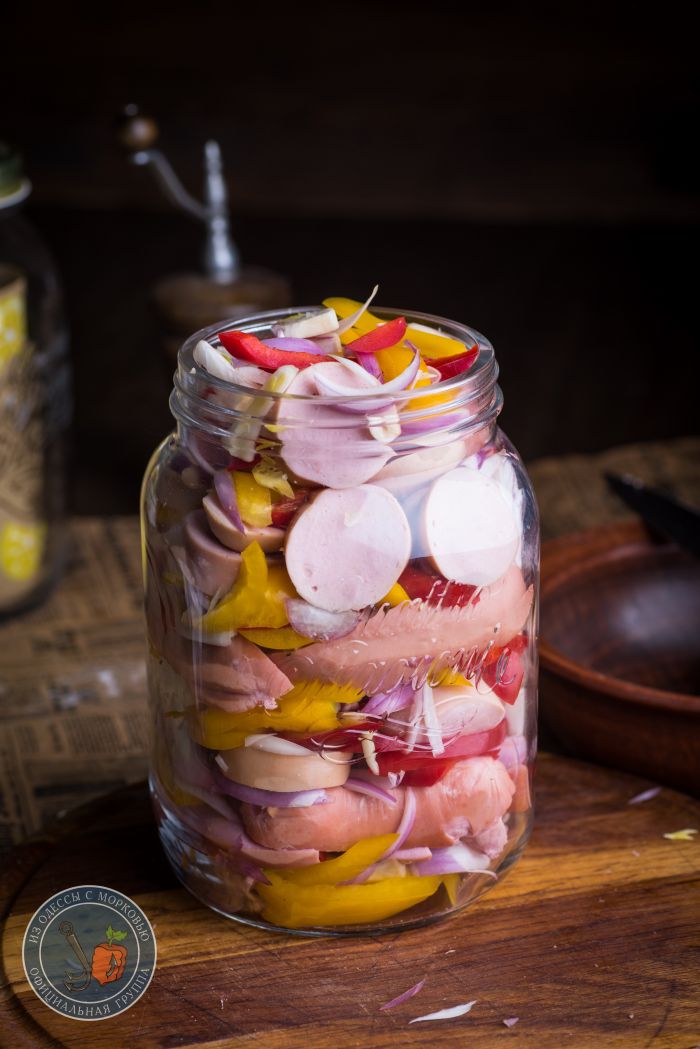 - Выложить овощи, чередуя их нарезанными сосисками, слегка прижимая. Слишком прессовать не рекомендую- в таком случае все покроется маринадом не равномерно. Последним слоем кладем овощи.
