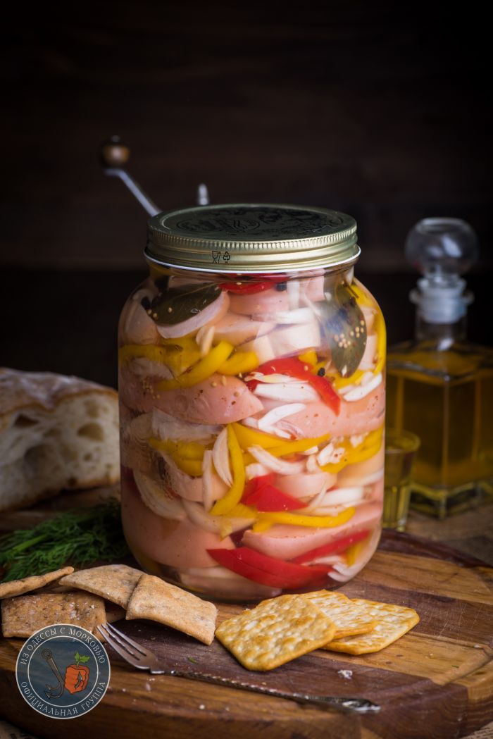 -Повторюсь, сардельки можно разрезать вдоль на половину глубины и раскрыв их слегка, как книжку, вложить внутрь полоску кислого огурца, лук и чили, например. Или того же сладкого перца. Смотрится такое интересно. Потом достать и нарезать.
