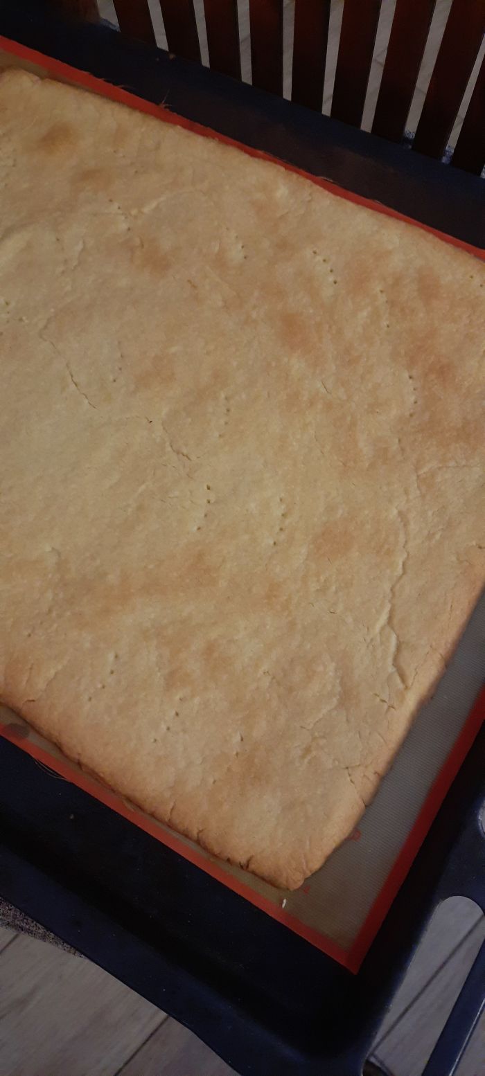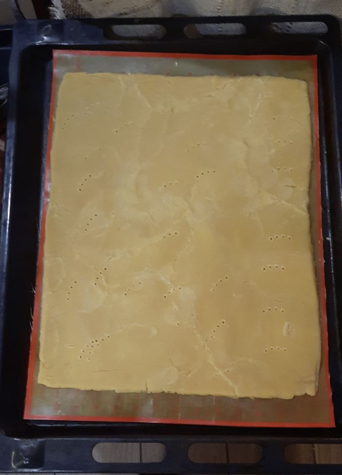 Делаем перерыв в приготовлении начинки. Включаем духовку на 200 градусов, достаём замерзшее тесто, кладём на противень и выпекаем 15 мин при 200 градусах не давая тесту зарумяниться.