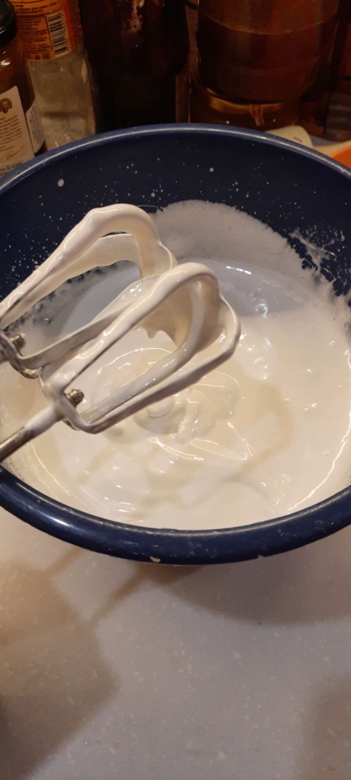Взбиваем белки с сахаром до мягких пиков. Сахара в классическом рецепте многовато на мой вкус, я кладу 180-190.