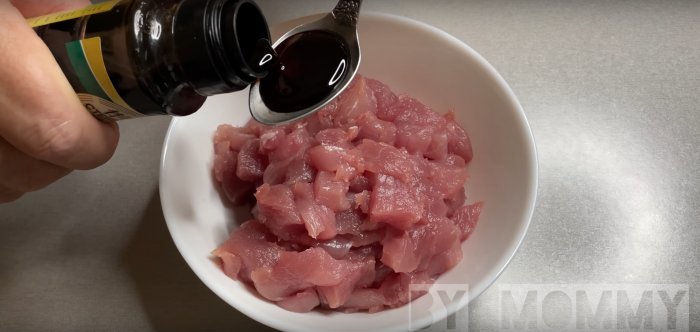 2) Далее маринуем мясо в соевом соусе. Маринование позволяет, во-первых, смягчить мясо перед термообработкой, а во-вторых уменьшить запах сырого мяса. Всё хорошо перемешиваем и оставляем мариноваться.