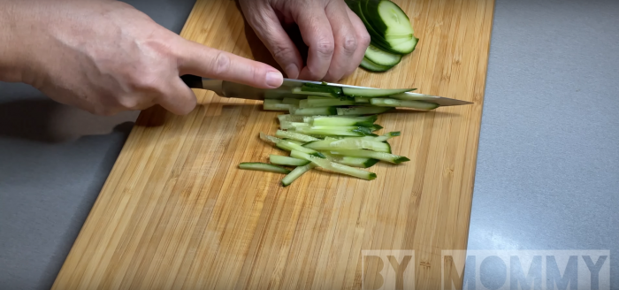 4) Огурец режем тонкой соломкой и будем использовать его в качестве топпинга: в конце украсим им готовое блюдо.