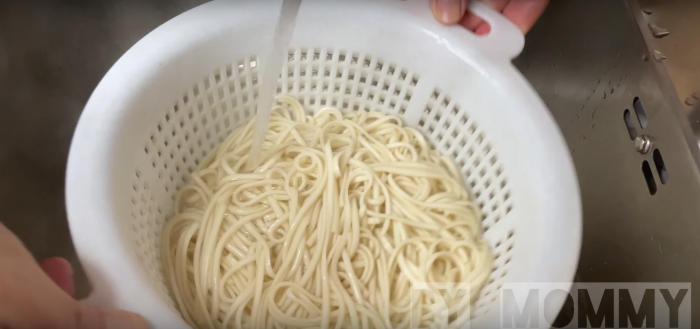 И как только снова закипит, откидываем на дуршлаг и промываем под холодной водой. Это нужно сделать обязательно, чтобы завершить процесс варки и предотвратить склеивание лапши.